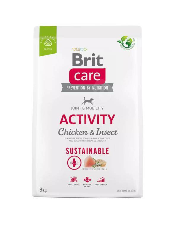 Esenciální amino kyseliny z hmyzího proteinuBrit care dog sustainability activity chicken insect je receptura bohatá na bílkoviny a kyseliny EPA a DHA, které jsou zodpovědné za zvýšení imunity, ochranu kůže mazlíčka a krásný vzhled jeho srsti. Zde přítomné bílkoviny pocházejí z kuřecího masa a hmyzu a vyznačují se vysokou stravitelností a velkým množstvím nenasycených mastných kyselin. Hmyzí protein se navíc vyznačuje vysokým podílem exogenních aminokyselin. Krmivo bylo obohaceno o extrakt z juky, který redukuje nepříjemný zápach trusu, a ostropestřec mariánský, rakytník a mateřídoušku, které podporuje trávicí systém.