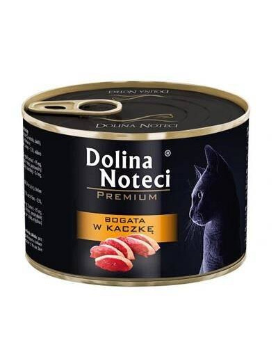Dolina Noteci pro kočky bohaté na kachny je kompletní vlhké krmivo pro dospělé kočky všech plemen. Hodnotné kachní maso poskytuje cenné živiny a přiměřený obsah bílkovin. Kachna je také zdrojem mastných kyselin, železa pro prevenci chudokrevnosti, selenu pro ochranu před oxidativním stresem a zinku pro podporu zdravého stavu pokožky. Krmivo z Doliny Noteci obsahuje vlhké, šťavnaté kousky masa, připomínající tak domácí pokrm, který svou vysokou chutností a intenzivním aroma jistě zaujme i tu nejvybíravější kočku. Krmivo poskytuje soubor vitamínů a minerálů nezbytných pro kočičí organismus, podporující imunitu a zdraví kočky, dále taurin - esenciální aminokyselinu podporující organismus. Receptura bez obilovin snižuje riziko alergických reakcí, díky čemuž mohou krmivo jíst i alergici na kočkySložení: