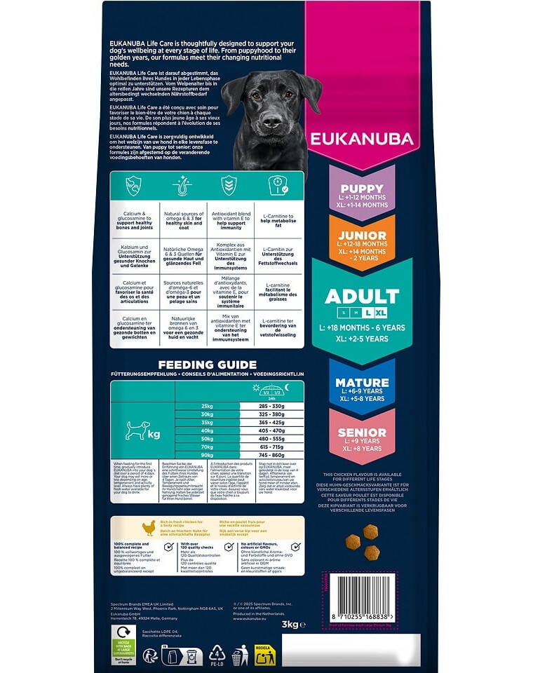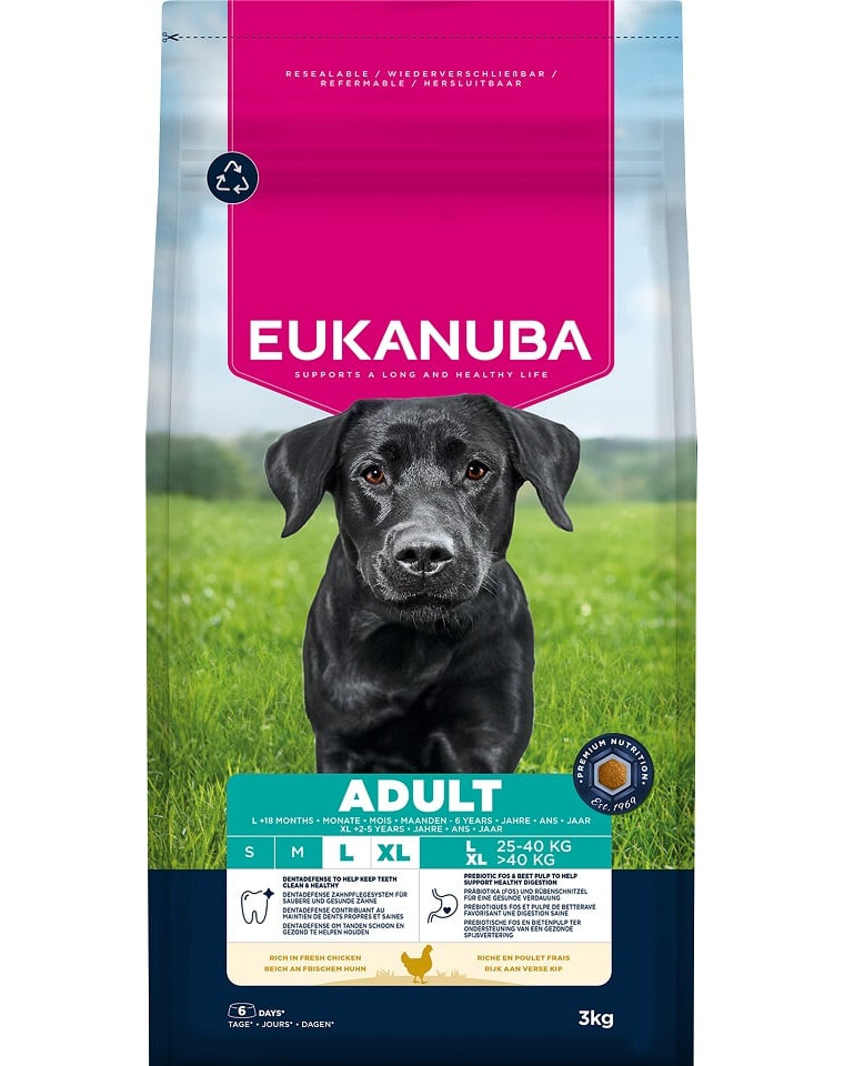 Krmivo pro dospělé psy, bohaté na čerstvé kuře, je 100% kompletní a vyvážené a ideální pro velké plemena ve věku od 18 měsíců do 6 let