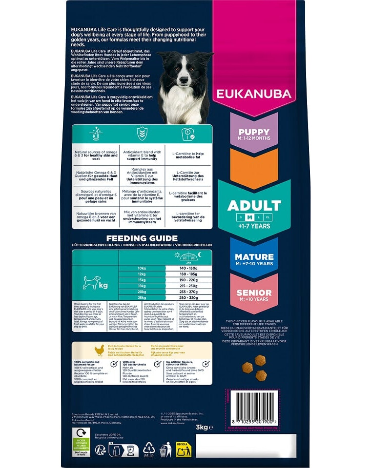 Krmivo pro dospělé psy, bohaté na čerstvé kuře, je 100% kompletní a vyvážené a ideální pro střední plemena ve věku od 1 do 7 let.