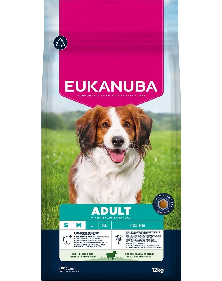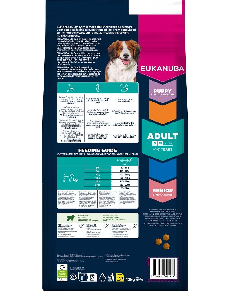 Sušené kuře a krůta (přírodní zdroj glukosaminu, chondroitinu a taurinu), jehněčí (14%), rýže (14%), kukuřice, sorgo, ječmen, vepřový tuk, sušené řepné řízky (2.6%), kuřecí omáčka, sušená celá vejce, lněné semínko, minerály (včetně heksametafosfátu sodného 0.35%), fruktooligosacharidy (0.25%, přírodní prebiotikum), mannanoligosacharidy (0.13%, přírodní prebiotikum).