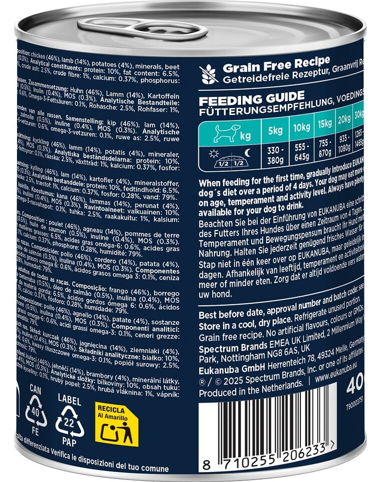 Kuřecí (46%), jehněčí (14%), brambory (4%), minerály, řepná dužina (0.5%), lososový olej (0.5%), inulin (0.4%), MOS (0.3%).