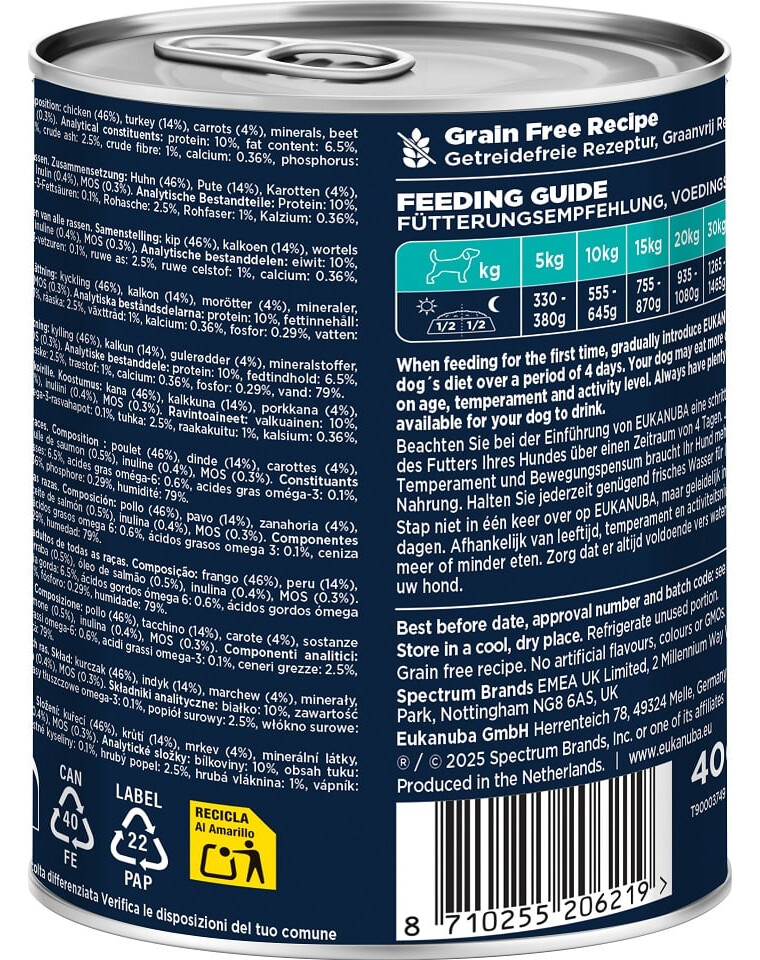 Kuřecí (46%), krůta (14%), mrkev (4%), minerály, řepná dužina (0.5%), lososový olej (0.5%), inulin (0.4%), MOS (0.3%).
