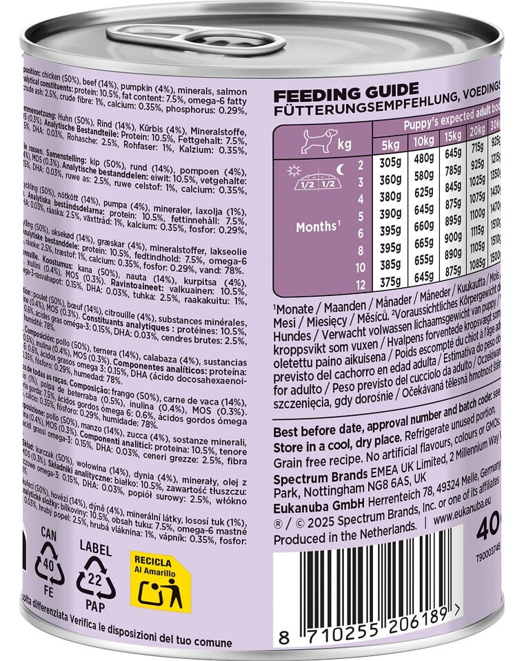 Kuřecí (50%), hovězí (14%), dýně (4%), minerály, lososový olej (1%), řepná dužina (0.5%), inulin (0.4%), MOS (0.3%).