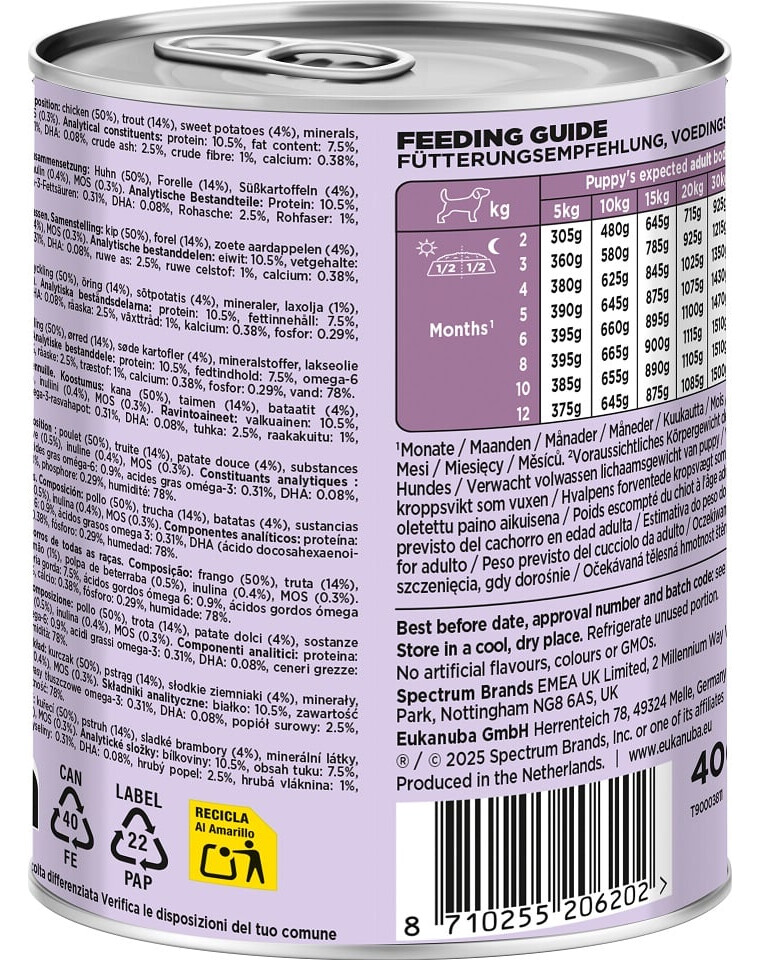 Kuřecí (50%), pstruh (14%), sladké brambory (4%), minerály, lososový olej (1%), řepná dužina (0.5%), inulin (0.4%), MOS (0.3%).