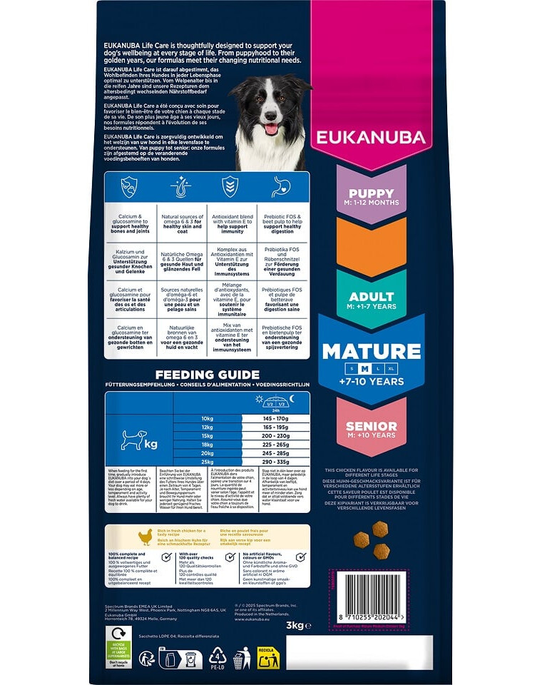 Krmivo pro dospělé psy, bohaté na čerstvé kuře, je 100% kompletní a vyvážené a ideální pro střední plemena ve věku 7–10 let.