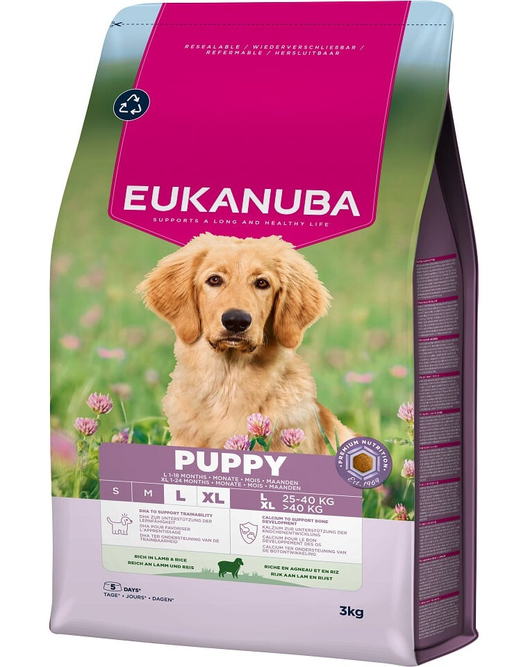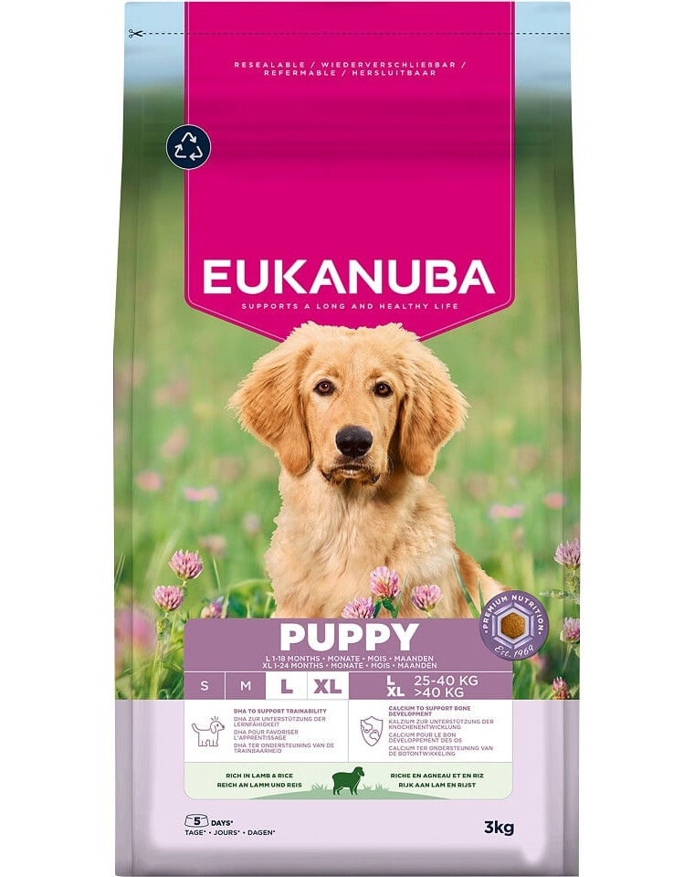 Krmivo pro štěňata, bohaté na jehněčí a rýži, je 100% kompletní a vyvážené a ideální pro velké plemena ve věku 1–18 měsíců