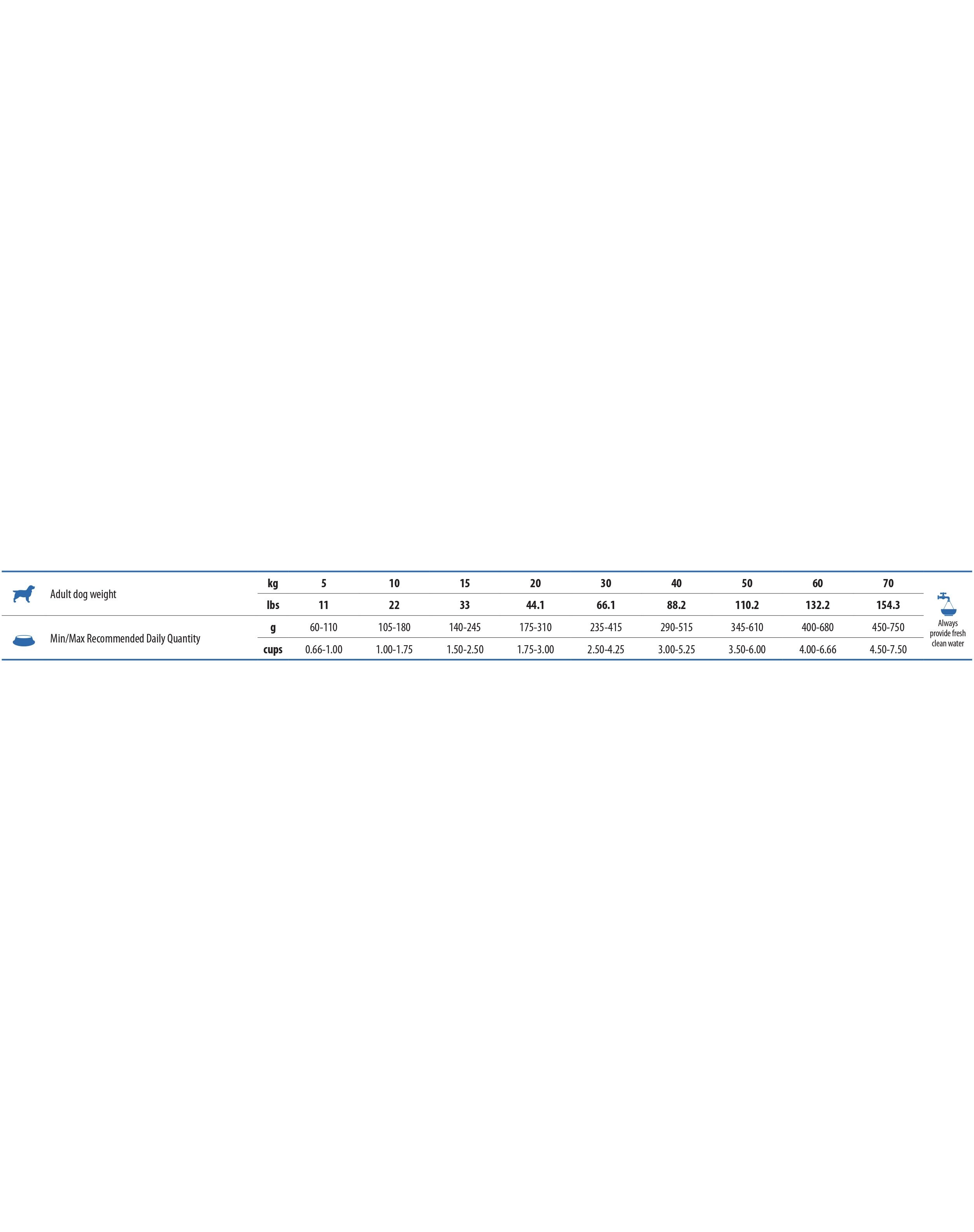 hrubý protein 23,00 %; hrubý tuk 12,00 %; hrubá vláknina 2,80 %; vlhkost 9,00 %; hrubý popel 7,90 %; vápník 1,10 %; fosfor 0,90 %; omega-3 mastné kyseliny 0,40 %; omega-6 mastné kyseliny 2,20 %; DHA 0,20 %; EPA 0,10 %; glukosamin 1200 mg/kg; chondroitin sulfát 900 mg/kg.