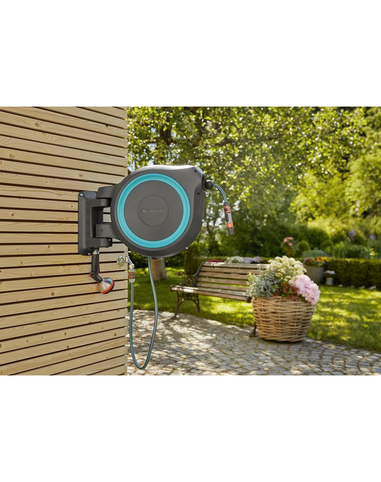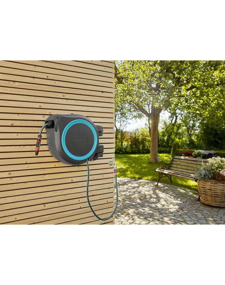 Nástěnný hadicový naviják, díky kterému ušetříte čas, místo a energii při zalévání zahrady. Kompaktní buben je připevněn ke zdi domu.