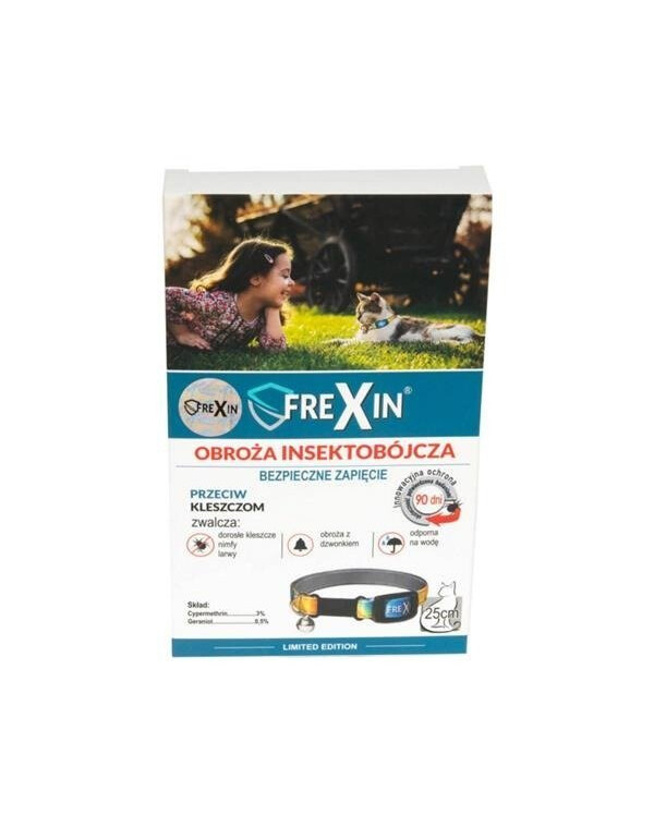 Insekticidní obojek FreXin zabíjí a/nebo odpuzuje klíšťata - jejich nymfy a larvy - a dospělé blechy, larvy a vajíčka. Inovativní ochrana pro psy, obojek snižuje riziko nákazy nemocemi přenášenými ektoparazity. Blechy jsou bezkřídlý hmyz, který se živí krví různých savců a ptáků. Blecha během svého života, který trvá 50 až 100 dní, naklade v průměru 30 vajíček denně. Zdravotní problémy způsobené blechami: bleší alergická dermatitida, přenos tasemnice psí, anémie. Blechy se nejčastěji vyskytují v pelíšcích domácích mazlíčků, na chodnících, kobercích a dalších místech, kde se zvířata zdržují. Je nesmírně důležité, aby se psí prostory pravidelně čistily a podestýlka prala, aby nedocházelo ke shlukování blech. Klíšťata jsou malí a škodliví parazité, kteří se živí krví psa nebo kočky. Nejčastěji se vyskytují v trávě, na loukách a v lesích. Hostitele hledají obvykle ráno Návod k použití: Po vyjmutí z obalu přizpůsobte délku obojku obvodu krku kočky pomocí posuvné spony a zapněte klip. Obojek nezapínejte příliš pevně.Kontraindikace obojku