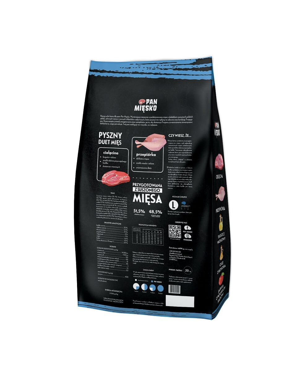 Sušené telecí maso (26%), sušená krůta (10%), hovězí tuk (10%), hrách, loupaný hrách, pšeničné otruby, klíčky pšenice, hydrolyzovaná kuřecí bílkovina (5%), hydrolyzovaná kuřecí játra (4%), sušená jablka (1%), minerální složky, sušené řízky z cukrové řepy, sušená čekanka (přirozený zdroj FOS a inulinu) (0,5%), lososový olej (0,5%), lněné semínko, sušené pivovarské kvasnice (0,5%), MOS (mannan-oligosacharidy) (0,5%), Jukka Mojave, glukosamin, chondroitin sulfát.