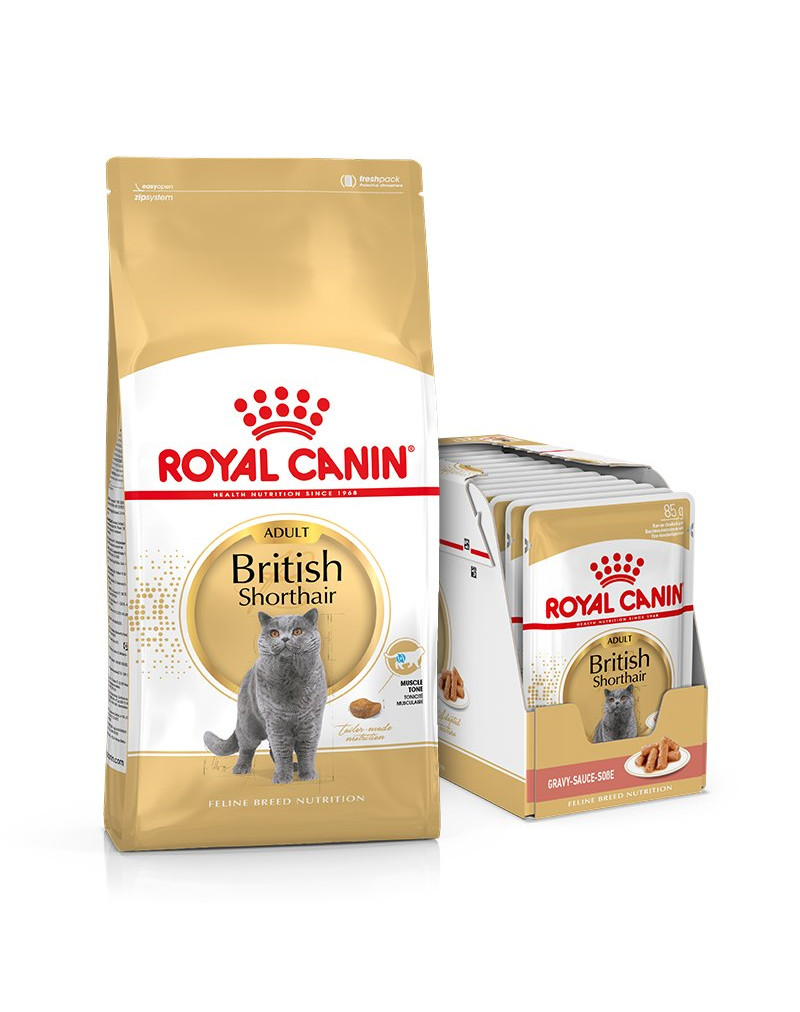 Aby mohlo uspokojit chutě co nejvíce koček, krmivo ROYAL CANIN® British Shorthair Adult je dostupné také ve vlhké formě jako kousky ve vynikající šťávě. Pokud přemýšlíte nad kombinovaným krmením, jednoduše se řiďte našimi pokyny, aby vaše kočka dostávala to správné množství suchého i vlhkého krmiva.