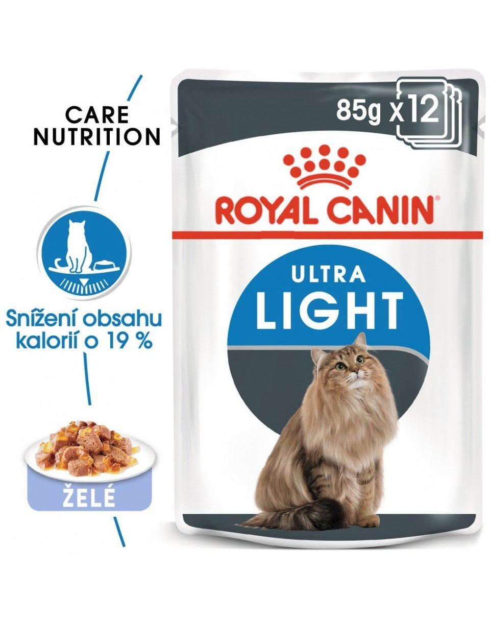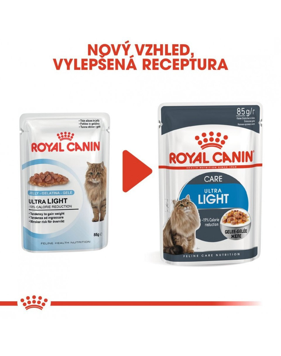 Pro zdraví vaší kočky je zásadní, aby měla ideální váhu. Ale to se snadno řekne, pokud má vaše kočka tendence přibírat a po krmení má stále hlad. Pokud vaše kočka není na konci krmení sytá a vy ji nepřekrmujete, protože se řídíte doporučenými denními dávkami, najít způsob, jak jí snížit váhu, je skoro nemožné. Kapsička pro kočky s nadváhou v želé ROYAL CANIN® Ultra Light in Jelly pomáhá redukovat kalorický příjem koček až o 19 %, díky čemuž nepřibírají a zůstávají ve správné váhové kategorii. Složení krmva je obohaceno o L‑karnitin, který podporuje a účastní se zdravého metabolismu tuků.